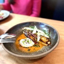 Very nice dinner, but not necessarily where I was expecting. The food was overall great, service was a bit uneven.. We waited a very long time between our second and third course while entree to dessert time was instantaneous. They add some random 6.5% charge which is very disappointing - wish they would include that in the menu prices instead. We got Potato caviar cloud - not as good as I expected, cloud was too soft, caviar got lost. And it felt like it needed a runny egg. Crudo- very delicious, great flavors, hard to screw up crudo any way but this was a good specimen. Progdog- gotta say this was the best hot dog I've ever had. It's very satisfying. Duck - was really expecting a great duck based on reviews and it was... Good. The rice was the highlight, so delicious and crispy parts were the best. Duck itself was okay - very mild flavour and I've definitely had lots of better duck breasts. The duck leg was actually really good though. I would not get it again if I came back. Semifreddo - wow!! Amazing dessert, such interesting combination. It had a jam at the bottom which I think actually took away from the dessert and made it a bit too sweet but really standout.